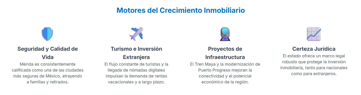 El crecimiento exponencial del mercado inmobiliario en Yucatán no es coincidencia. Se sustenta en cuatro pilares sólidos que crean un entorno de confianza y atractivo para la inversión nacional e internacional.