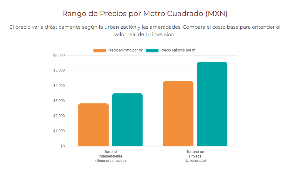 - Privada Residencial vs. Terreno Independiente: Es el factor más influyente. Los lotes en privadas comandan precios más altos por incluir amenidades, seguridad e infraestructura planificada. Los terrenos independientes pueden parecer más económicos, pero a menudo carecen de servicios básicos, implicando costos futuros.