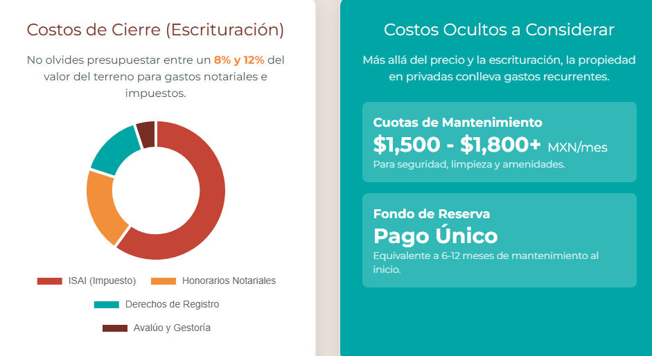 - Cuotas de Mantenimiento: Costo mensual ineludible en una privada para seguridad, limpieza y áreas comunes. Puede ser un monto fijo o calcularse por $m^2$ (ej. $5.00 a $6.00 MXN por $m^2$).