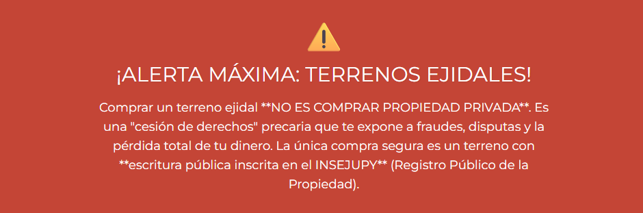 REGLA DE ORO: La palabra "ejidal" debe ser una bandera roja inmediata. Evita por completo estos terrenos y enfócate exclusivamente en propiedad privada con título inscrito en el INSEJUPY.