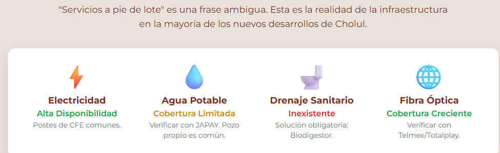 ¡Atención! La frase publicitaria "servicios a pie de lote" suele ser ambigua y puede significar únicamente un poste de CFE cercano. Pregunta explícitamente y pide confirmación por escrito.