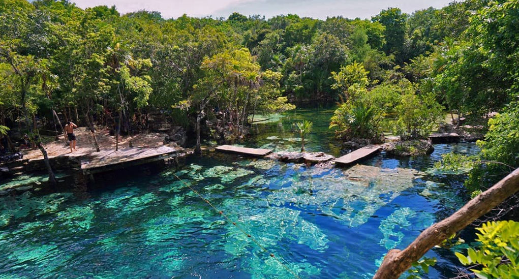 - Cenote Azul (Playa del Carmen): La piscina natural familiar por excelencia, con diferentes profundidades y plataformas de salto.