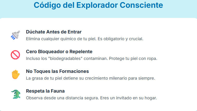 - Regla de Oro: Cero Químicos. Está estrictamente prohibido usar protector solar, repelente o cremas antes de entrar al agua, incluso si son "biodegradables". Es obligatorio ducharse antes.