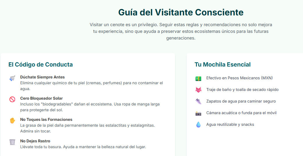 Los cenotes son un archivo geológico, un templo subacuático y un ecosistema único. Visitar un cenote es un privilegio que conlleva la responsabilidad de protegerlo. Al ser un visitante consciente, apoyando a las comunidades locales y respetando las reglas, cada viajero se convierte en un guardián activo de este extraordinario legado.