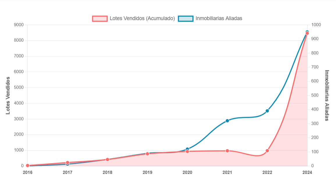 | Año | Lotes Vendidos (Acumulado) | Inmobiliarias Aliadas | Colaboradores | Desarrollos (Total) |