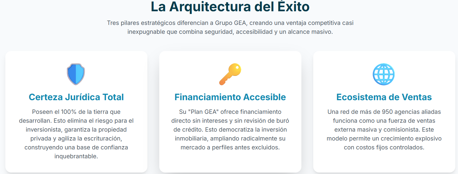 - Fortalezas: Modelo de negocio de bajo riesgo (propiedad de la tierra), motor de ventas escalable, financiación accesible ("Plan GEA"), marca fuerte y banco de tierras estratégico.