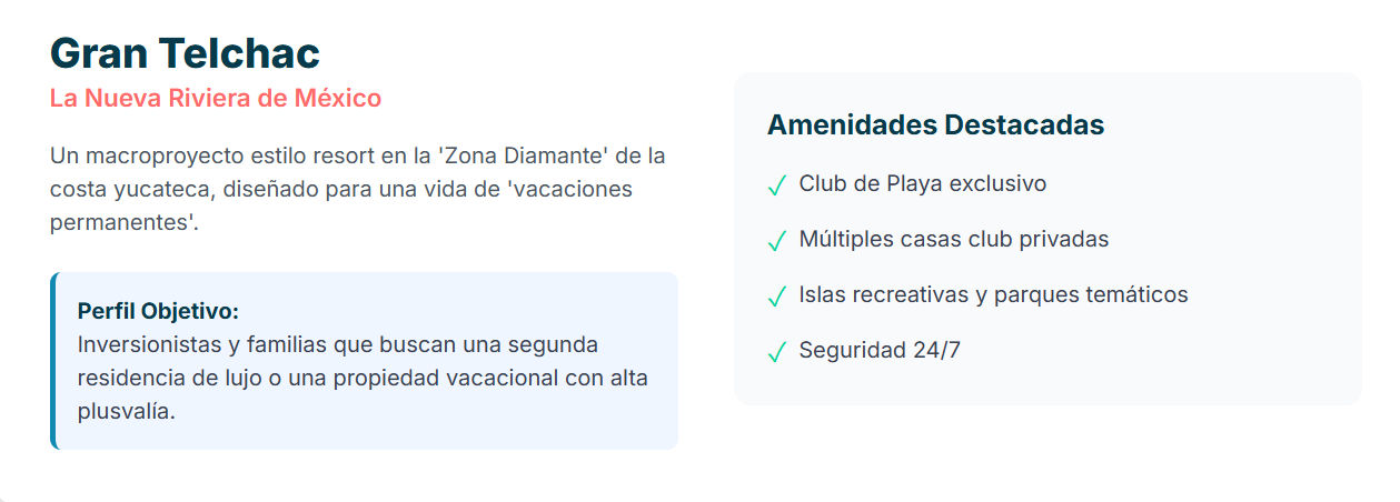 | Gran Telchac | Telchac, Yucatán | Residencial de playa tipo resort. | Inversionistas y familias (segunda residencia). | Múltiples casas club, Beach Club, parques temáticos. |