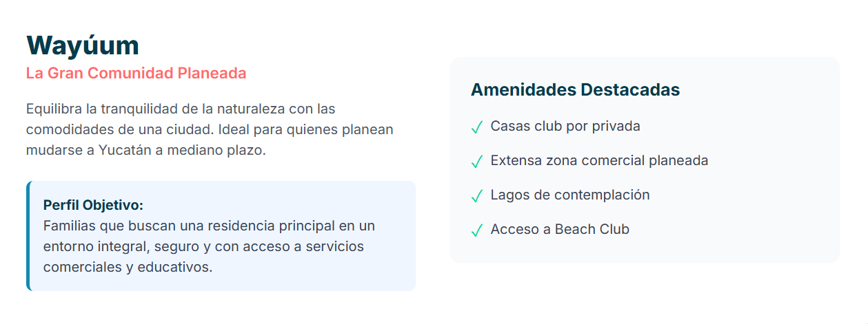 | Wayúum | Chicxulub, Yucatán | "Gran Comunidad Residencial" planeada ("slow living"). | Familias que planean mudarse a Yucatán a mediano plazo. | Casas club, lagos, zona comercial, Beach Club. |
