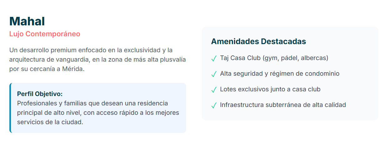 | Mahal | Conkal, Yucatán | Residencial contemporáneo premium y exclusivo. | Profesionales y familias (residencia principal). | Taj Casa Club, alta seguridad, acceso a Beach Club. |