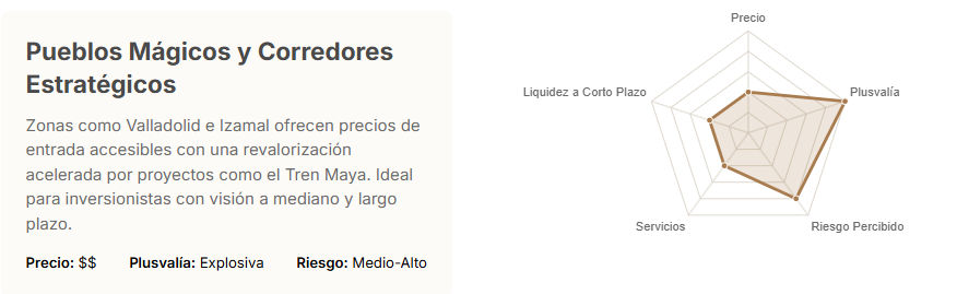 | Valladolid / Izamal | Inversión/Residencial | Precios de entrada accesibles | Pueblos Mágicos, influencia del Tren Maya, turismo cultural.¹ |