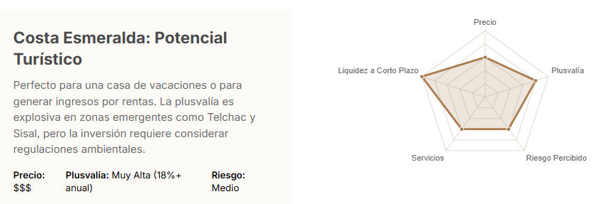 | Telchac (Costa) | Playa/Residencial | $2,817.07 | Atractivo turístico, desarrollos con club de playa, potencial de renta vacacional.³ |