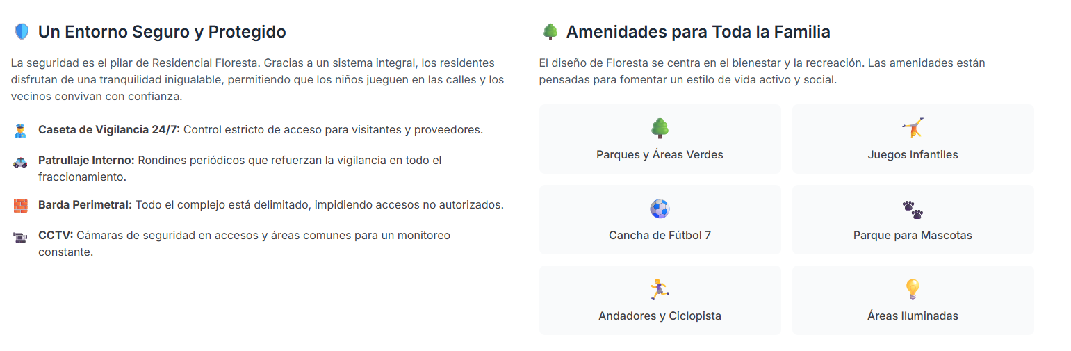 | Seguridad | Alta, basada en diseño de clusters | Estándar para fraccionamiento abierto | Alta, basada en cerradas con vigilancia 24/7 |